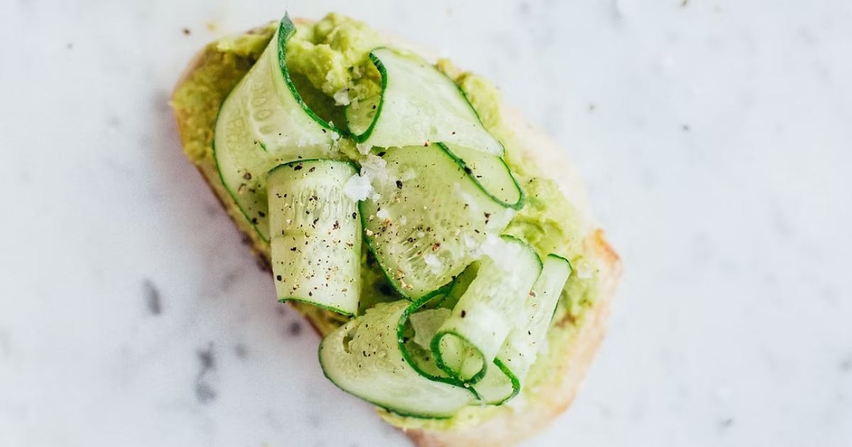 Fresh cucumber ribbons, creamy avocado, sea salt, and cracked pepper layered on crisp toast for a simple, refreshing breakfast or light lunch.