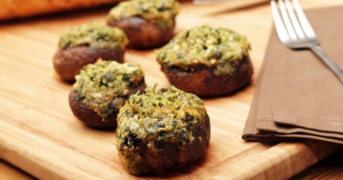 A bite-sized take on spinach artichoke dip, tucked into mushrooms and baked for a simple starter or snack.